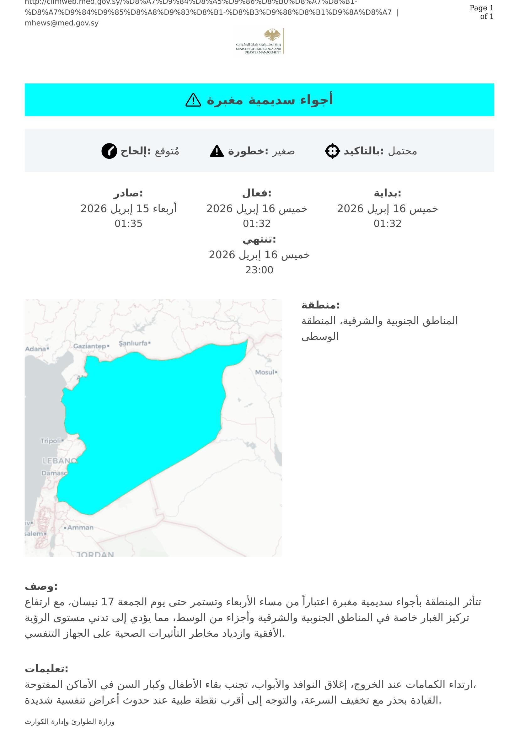 تتأثر المنطقة بأجواء سديمية مغبرة اعتباراً من مساء الأربعاء وتستمر حتى يوم الجمعة 17 نيسان، مع ارتفاع تركيز الغبار خاصة في المناطق الجنوبية والشرقية وأجزاء من الوسط، مما يؤدي إلى تدني مستوى الرؤية الأفقية وازدياد مخاطر التأثيرات الصحية على الجهاز التنفسي.