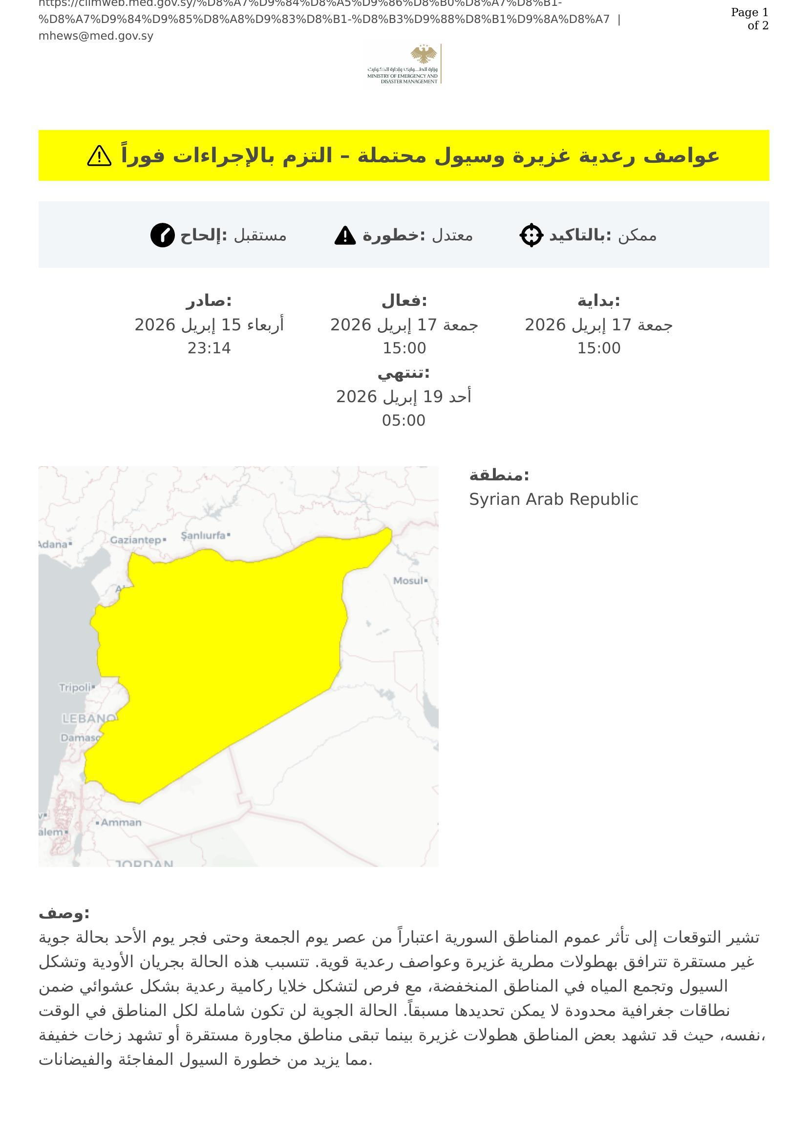 تشير التوقعات إلى تأثر عموم المناطق السورية اعتباراً من عصر يوم الجمعة وحتى فجر يوم الأحد بحالة جوية غير مستقرة تترافق بهطولات مطرية غزيرة وعواصف رعدية قوية. تتسبب هذه الحالة بجريان الأودية وتشكل السيول وتجمع المياه في المناطق المنخفضة، مع فرص لتشكل خلايا ركامية رعدية بشكل عشوائي ضمن نطاقات جغرافية محدودة لا يمكن تحديدها مسبقاً. الحالة الجوية لن تكون شاملة لكل المناطق في الوقت نفسه، حيث قد تشهد بعض المناطق هطولات غزيرة بينما تبقى مناطق مجاورة مستقرة أو تشهد زخات خفيفة، مما يزيد من خطورة السيول المفاجئة والفيضانات.